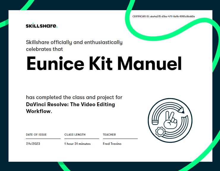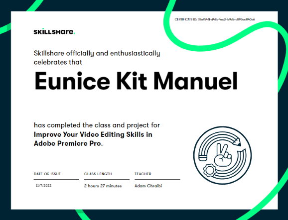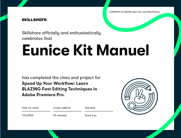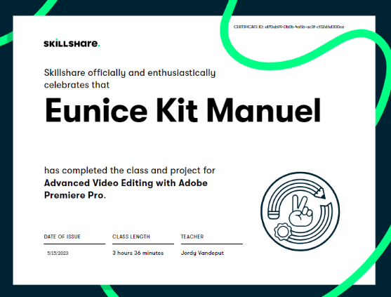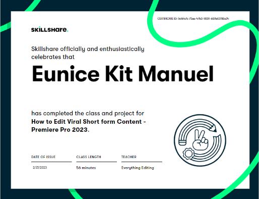 Throughout the class, I have acquired a diverse range of skills and knowledge in the field of video editing. I have learned various editing workflow techniques, explored advanced settings and options, and mastered the art of working with shortcuts for increased efficiency. I also have gained expertise in incorporating captions and subtitles, creating custom presets and templates, applying seamless transition techniques, stabilizing and reversing motion clips, utilizing time remapping, implementing masking and tracking, performing color correction and grading, enhancing audio quality,